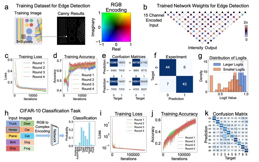 图3. 光子神经网络用于图像边界检测和图像分类任务。(a) 将3×3图像块编码为复振幅,色相表示相位,亮度表示强度,目标来自Canny数据边界检测;(b) 网络构型及第一轮训练中的权重分布;(c) 边界检测的训练损失函数曲线;(d) 边界检测的训练准确率曲线;(e) 边界检测的测试集混淆矩阵;(f) 实验测得的边界检测混淆矩阵;(g) 实验测得的边界/非边界分类的输出分布。(h) CIFAR-10图像分类任务;(i) CIFAR-10分类的训练损失曲线;(j) CIFAR-10分类的训练准确率曲线;(k) CIFAR-10测试集上的混淆矩阵。