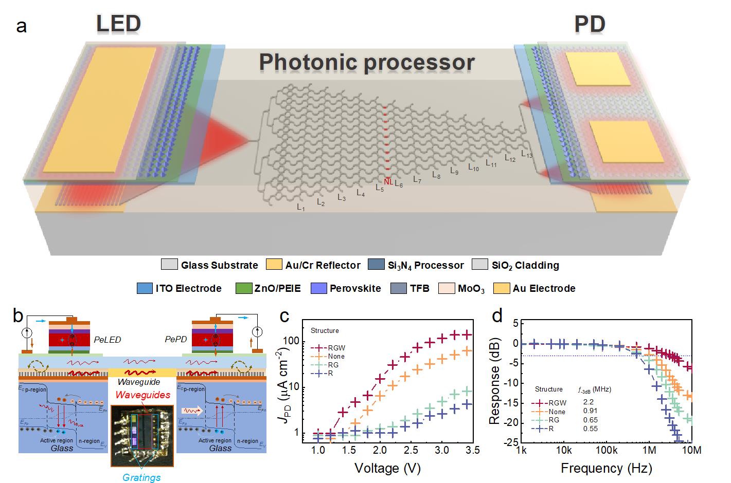 图1. 单片异质集成的钙钛矿/氮化硅光子芯片系统。(a) 异质集成片上钙钛矿/氮化硅光子芯片系统的结构示意图;(b) 单片集成的钙钛矿发光二极管、光电探测器和氮化硅波导网络的工作原理示意图,插图展示了拍摄的单片集成芯片光子系统照片;(c) 不同结构的光电流-驱动电压曲线;(d) 不同结构的系统频率响应。