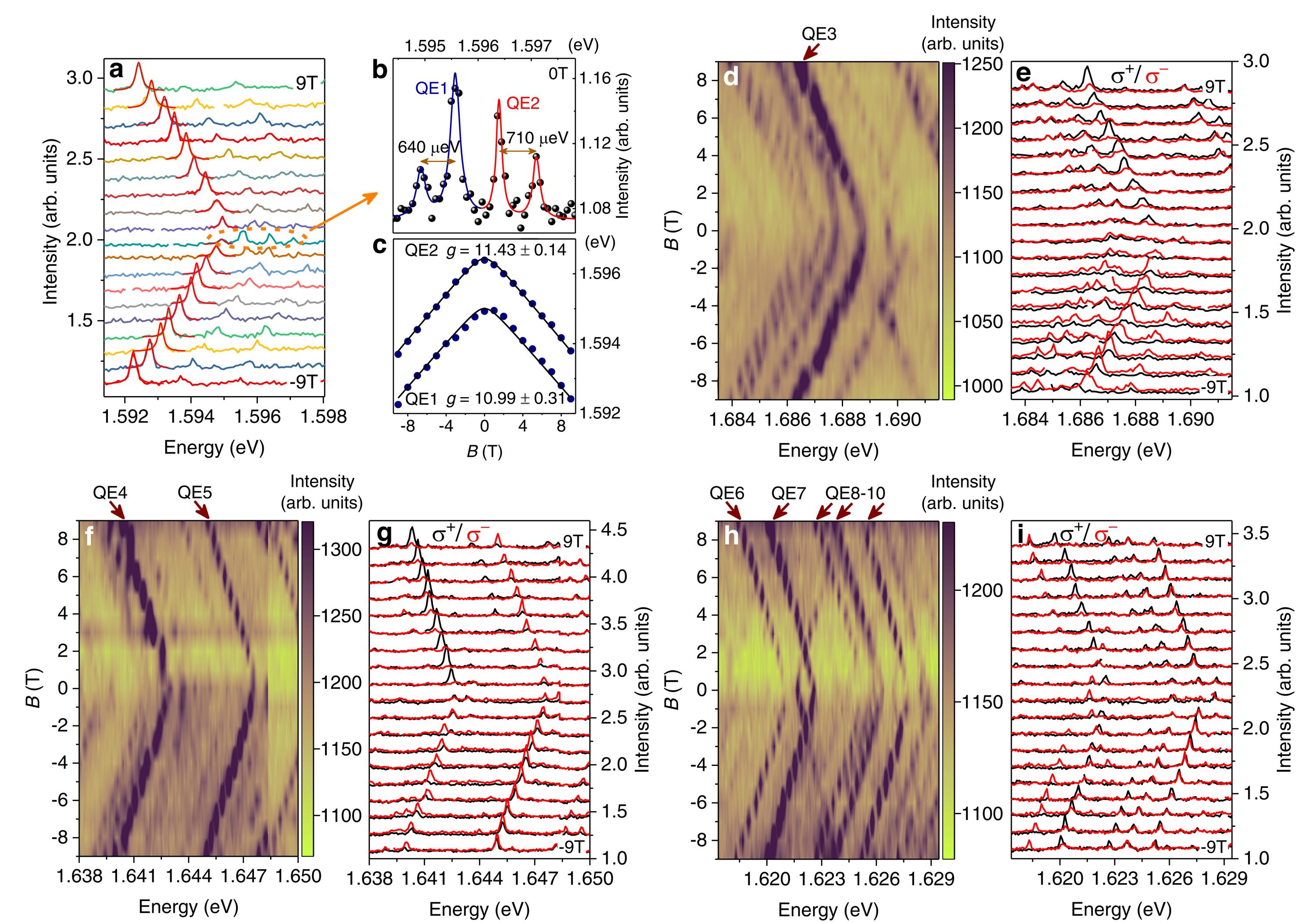 图2.手性场作用下的QE圆偏分辨的磁光光谱测量。(a,b,c)竖直磁场下QE1和QE2的PL光谱和g因子拟合。(d,f,h)QE3-10磁场依赖的PL光谱,和(e,g,i)对应的圆偏分辨的PL光谱。