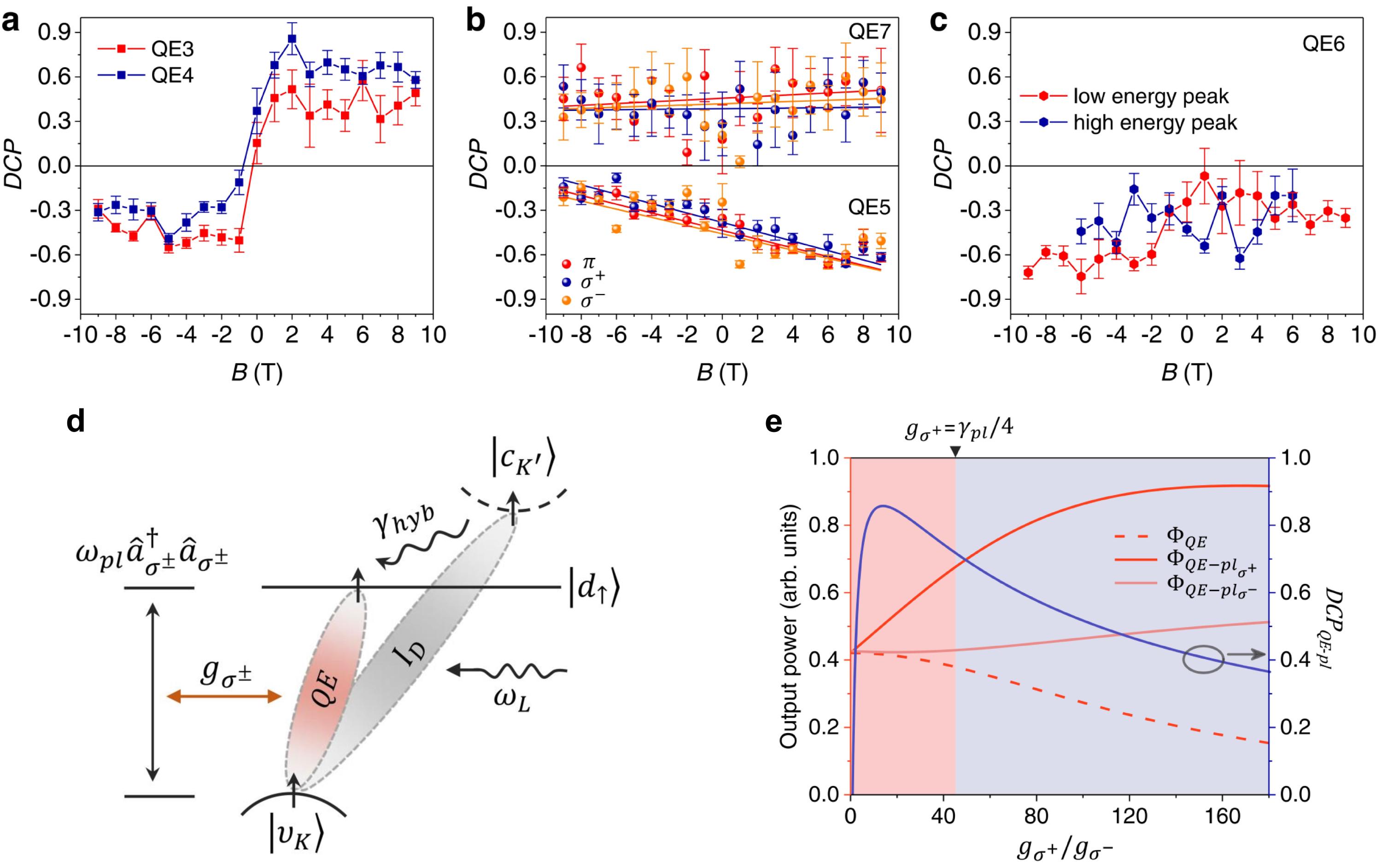 图3.(a,b,c)测量到的QE圆极化自由度(DCP)随磁场的变化。(d,e)QE与手性等离激元耦合体系的动力学研究与求解。