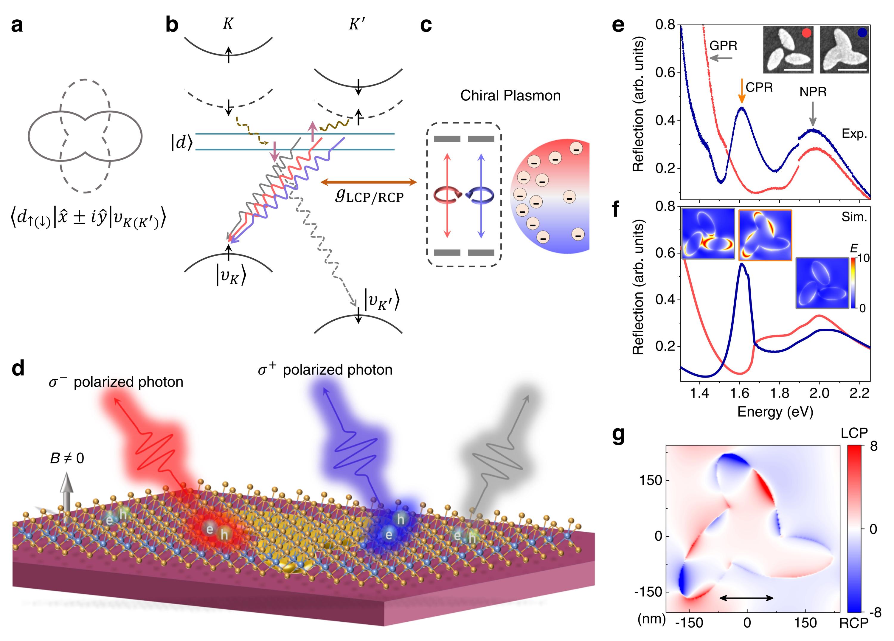 为了证明手性场作用下QE反常的光子输出并不是由纳腔的远场辐射所造成的,研究中建立了谷间缺陷激子与手性等离激元纳腔耦合的全量子理论模型(图3d),并利用量子主方程对该模型进行了求解。通过对耦合体系中不同辐射通道的输出能量进行求解(图3e)并计算QE对输出圆极化度的贡献后得到,耦合体系的圆偏振输出,主要来自于受纳腔强烈调制的QE的自发辐射。这进一步证明了在这种谷间缺陷激子中,谷极化效应等谷保护特性是完全缺失的。该项研究不仅实验上证实了谷间缺陷激子态的谷对称性的打破,还开发了一种新的控制单光子偏振态的纳米技术,为未来基于单光子的等离激元光子学研究提供了基础。