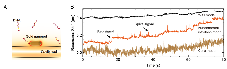 实验上,课题组首先成功制备出壁厚约为1 μm的微泡腔,并利用热光效应筛选出高品质的界面模式;进一步将微泡腔接入微流系统构成微流光学传感器。随后,利用三种模式测量链霉亲和素蛋白(Streptavidin)和生物素化牛血清白蛋白(BSA-biotin)之间的特异性吸附,实验结果证实了理论预测,展示出界面模式可以将表面传感灵敏度最大化(图2),其表面探测极限预计可达到0.3 pg/cm2;进一步结合各种信噪比增强技术,界面模式的传感灵敏度能够进一步提升。例如,课题组利用金纳米棒的表面等离激元共振对传感器进行二次增强,在微流环境下实现单链DNA分子的检测,单分子吸附信号清晰可见(图3)。