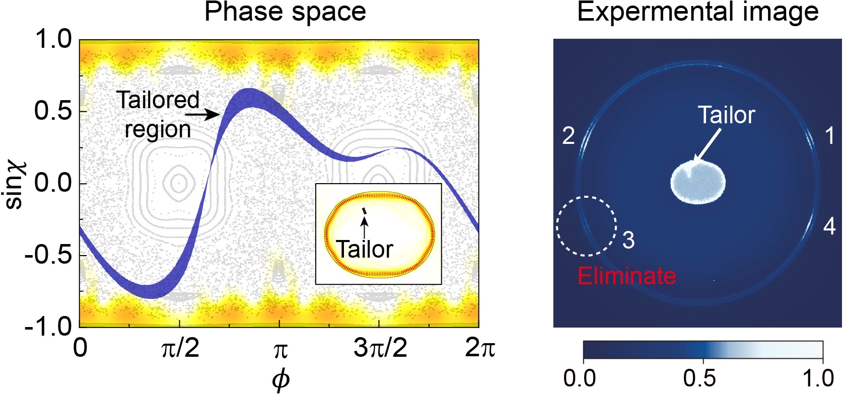 微腔光场调控在基础光物理研究和先进光学技术发展中具有重要意义。通常的微腔光场调控研究主要在实空间或动量空间中进行,虽已被成功应用于量子光学、精密测量等诸多领域,但迄今仍无法充分发挥优势。为了完备描述一个物理系统的动力学特征,必须同时涵盖动量和空间维度的信息,“相空间”的概念应运而生,其对统计力学、混沌物理等学科的发展起到至关重要的作用。上个世纪90年代,相空间被首次引入微腔光子学研究,为非对称光学微腔内的动力学轨道研究构造出一幅直观、清晰的物理图像。然而,对于非对称微腔的光场调控,人们一般通过调整腔的边界形状改变对应的相空间来实现;这种全局性的调控虽然能够研究部分腔形依赖问题,但它无法原位控制的特点仍然制约着非对称腔领域的发展,尤其是对相空间中特定动力学过程的探索。