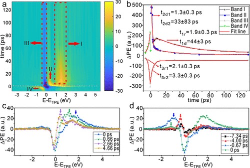 时间分辨能量谱(图3)则进一步揭示了处于高激发态的电子以皮秒尺度转移至表面缺陷态并被束缚,缺陷态的动力学占据了表面电子弛豫的主要部分,导带自由电子的衰减在表面只占有很小的比例。这种动力学特性是钙钛矿表面动力学的主要特征,均匀地分布在整个钙钛矿表面。这表明了钙制约钙钛矿性能的主要因素是材料表面的深能级缺陷,进行表面缺陷钝化对钙钛矿材料器件器件性能提升具有重要意义。