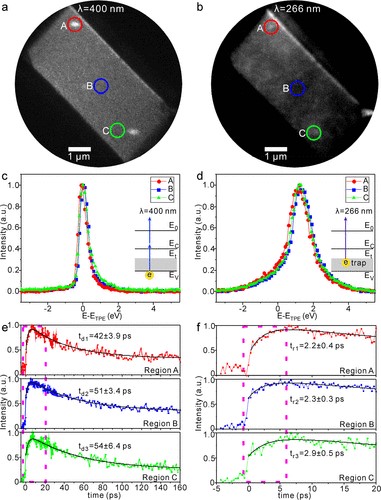 实验上,研究团队利用研制的飞秒时间分辨光电子显微系统(fs-PEEM),对无机钙钛矿CsPbBr3晶片进行时空特性研究(图1)。光电子成像系统可以探测超快时间,超小空间和能量分辨三个维度的信息。根据缺陷态对光电子波长的选择性,可明确识别出晶片内部局域的结构缺陷,以及晶体表面均匀分布的浅层缺陷。能量谱(图2a、b)显示了体内结构缺陷属于浅能级缺陷,而广泛存在于表面的则属于深能级缺陷。时间分辨表面光电子动力学的结果(图2c、d)则表明钙钛矿表面动力学由表面的特性控制,而内部结构缺陷对动力学(图2e、f)则几乎没有影响,即钙钛矿对结构的缺陷具有高容忍性。