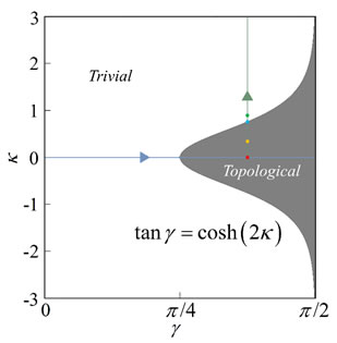 图1 由耦合强度γ和增益损耗量κ决定的二维拓扑相图。拓扑相界面由数学关系tanγ=cosh(2κ)描述。