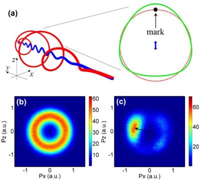 图3. 增强型阿秒钟的原理。(a)线偏振的二次谐波打破了圆偏振的基频光的对称性,标记了最大值激光电场的方向与时刻。(b)不加二次谐波时测量的光电子动量谱。(c)加入标记光场后测量的光电子动量谱。