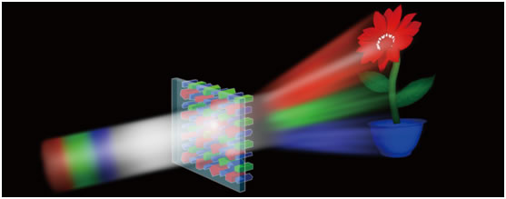 红绿蓝三色光照射到超表面高色差全息上,形成彩色图像