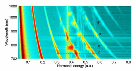 图1:不同激光波长下的谐波辐射信号。从图中可以看出随着波长变化,谐波产率受到很大的调制。文章分析了产率受到调制的几种机制。