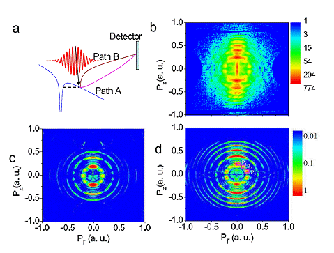 原子分子的多光子电离和隧道电离一直是强场光物理的研究前沿,在原子分子结构成像、量子调控等方面具有重要应用。人们对多光子电离的认识一般是通过量子理论,但量子理论是基于波函数和薛定谔方程,所得到模拟结果是物理上“不透明的”(not physically transparent),人们很难直接实现电子的动力学分析。 “飞秒光物理和介观光学”创新研究群体刘运全研究员、彭良友副教授和龚旗煌教授等发展了一套量子轨迹蒙特卡罗(Quantum-Trajectory Monte Carlo-QTMC)理论。他们通过蒙特卡罗模拟,把隧道电离理论和费曼路径积分相结合(如图1a),获得了原子多光子电离全微分光电子角分布的干涉物理起源(如图1c,d)。在实验上,他们通过新建成的冷靶电子离子动量谱仪,测量了高分辨氙原子多光子电离的光电子角分布(图1b)。通过QTMC理论的计算结果与实验结果非常符合。为了进一步证实理论结果,他们还通过精确求解含时薛定谔方程(Time-Dependent Schrödinger Equation-TDSE)对该理论计算给予验证。