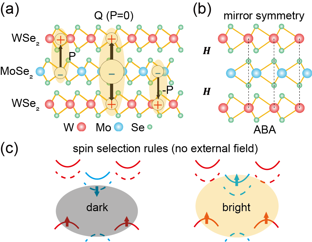 (a):三层异质结的激子示意图;(b):堆垛方式及对称性;(c):电四极激子的辐射选择定