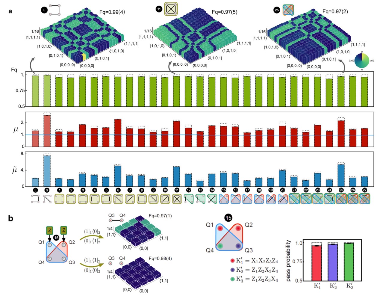 图3. 量子超图态的纠缠判定及其盲量子计算演示。(a)量子态层析重构密度矩阵、量子态保真度、Mermin不等式违背测量实验结果;(b)基于测量的量子计算基本操作与颜色编码验证。