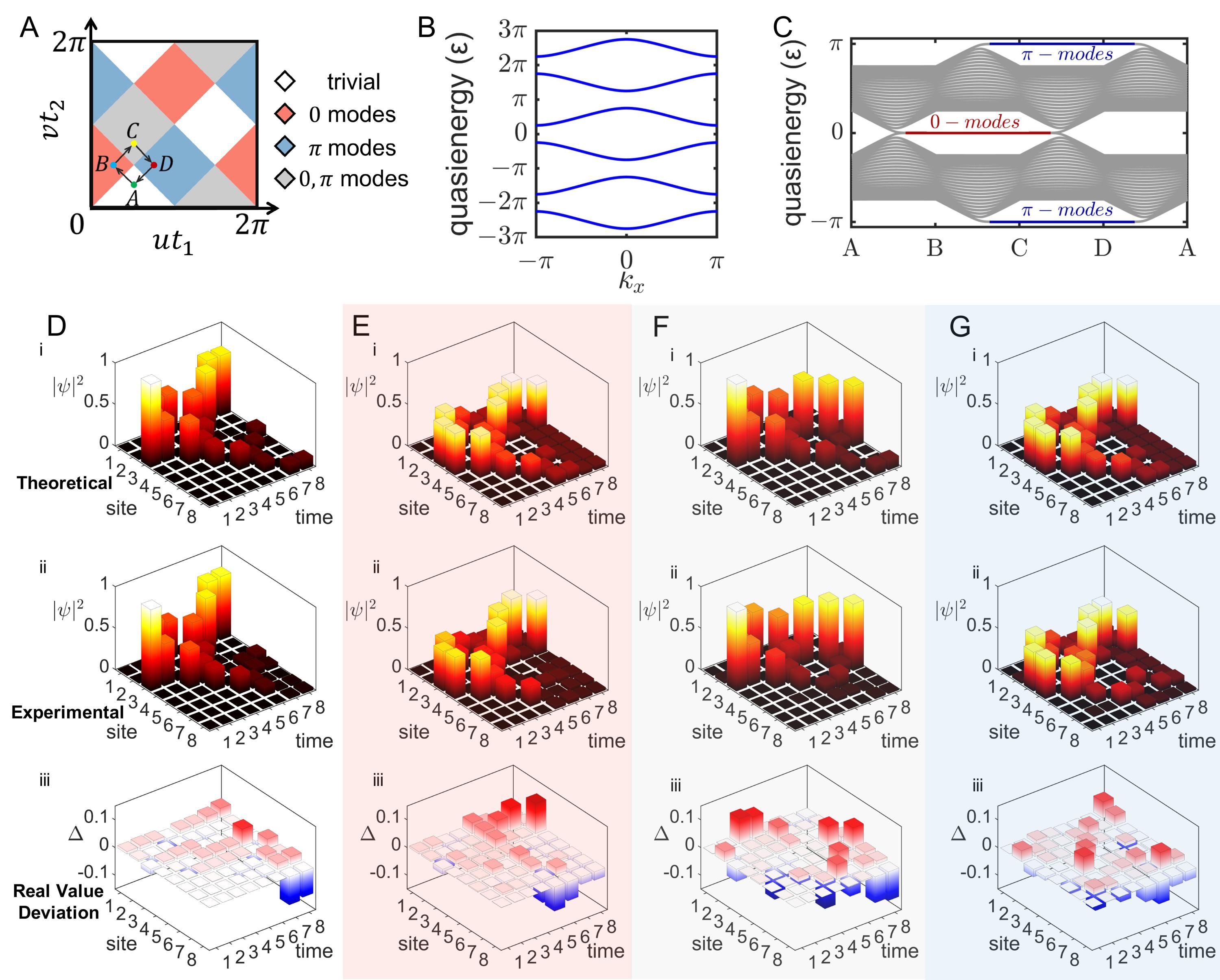 图2. 一维弗洛凯SSH模型量子模拟结果。(A) 一维弗洛凯SSH模型拓扑相图。(B)一维弗洛凯SSH模型在周期性边界条件下的准能谱。(C) 一维弗洛凯SSH模型在开边界条件下的准能谱。平庸(D)、拓扑0模(E)、拓扑π模(F)、以及拓扑0模π模同时存在(G)这四种拓扑相下量子态的演化过程。