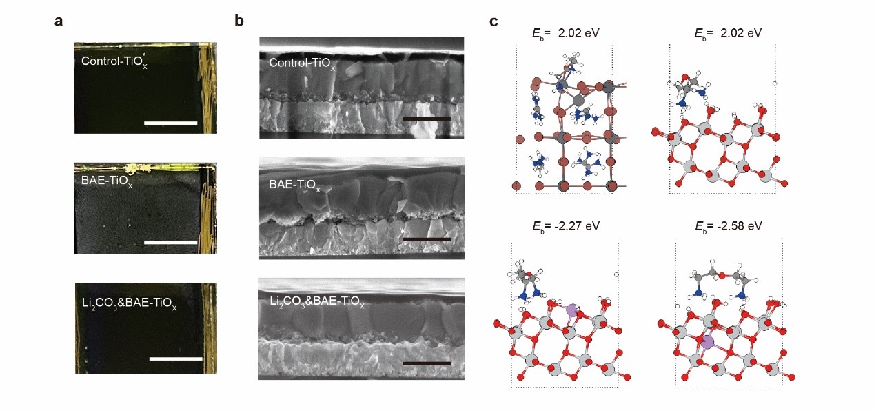 图1. 不同处理策略所制备的钙钛矿太阳能电池:(a)背面光学照片;(b)截面扫描电镜照片;(c)界面分子与钙钛矿或金属氧化物电荷传输层的结合能(理论计算)。